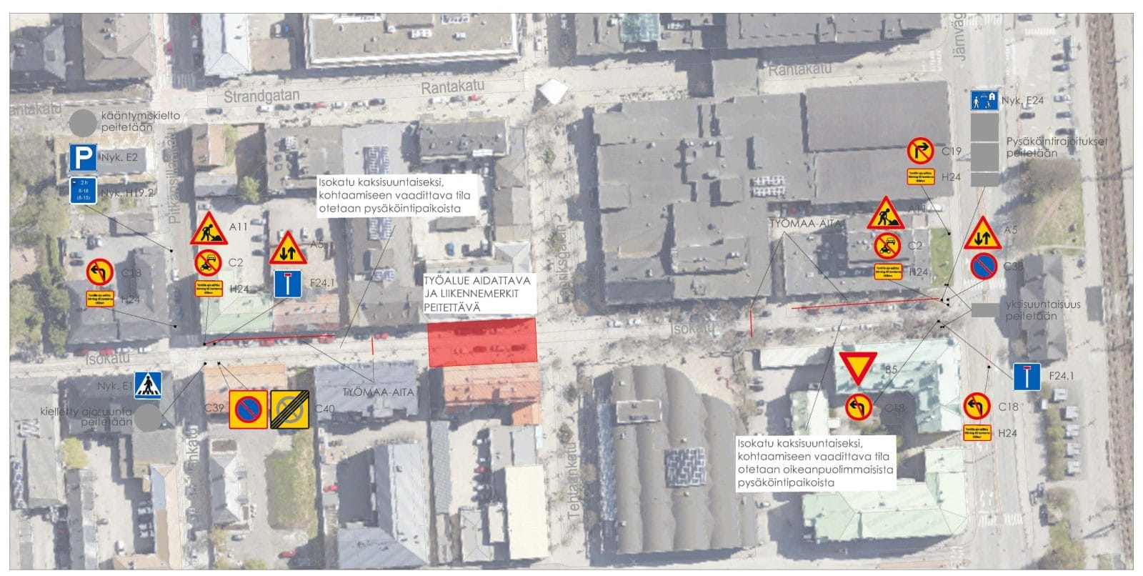 Isokatu suljetaan tilapäisesti liikenteeltä maanantaina 20.4. ja tiistaina 21.4. klo 17–22. Katualue aidataan sääsuojan asentamista varten kiinteistön Isokatu 6 kohdalla. Kiinteistöä remontoiva Kaarlela Group vastaa asennustöistä, alueen aitaamisesta ja kadun sulkemisesta sekä tilapäisistä liikennejärjestelyistä työn aikana.